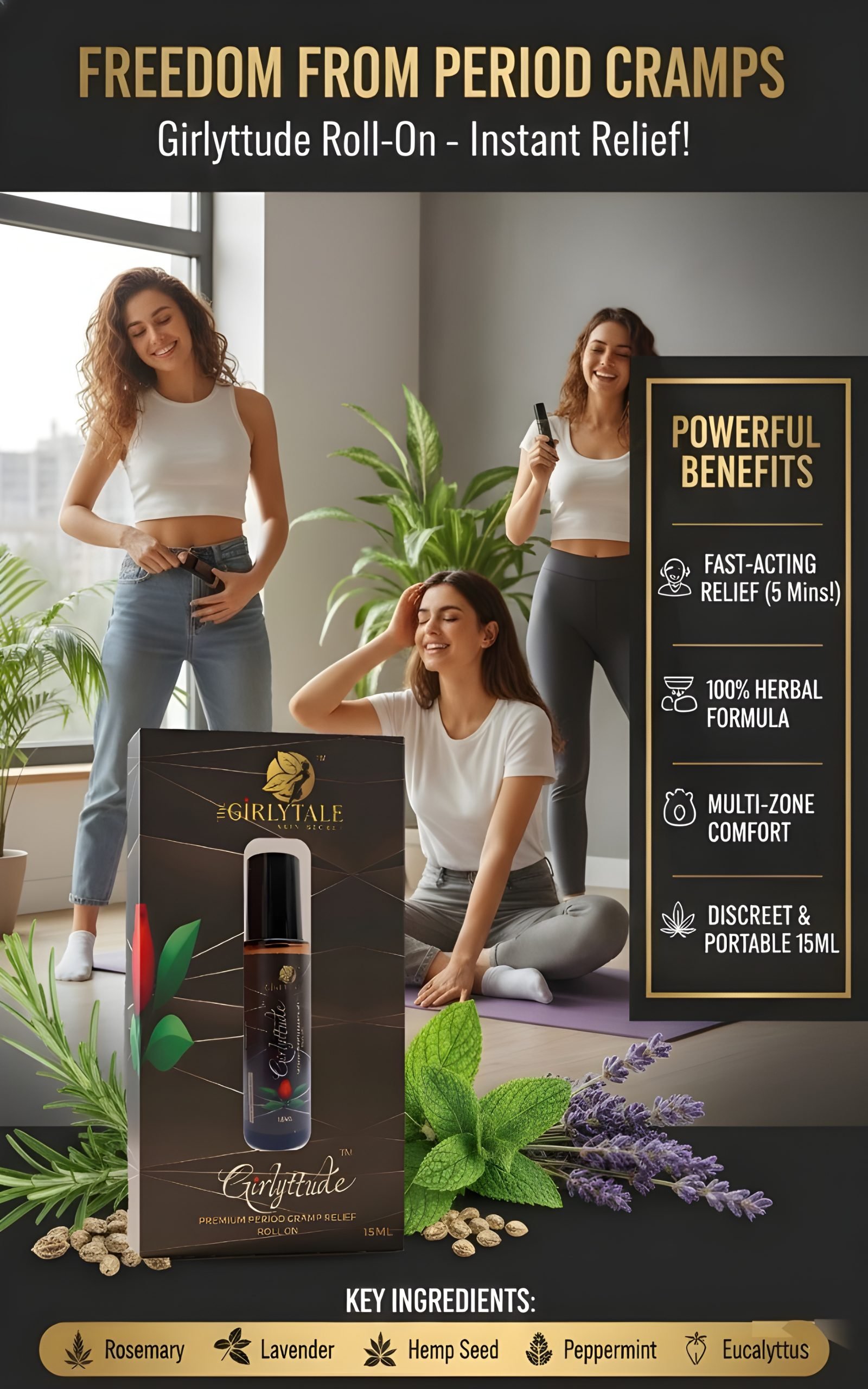 Girlyttude Premium Period Cramp Relief Roll On – Natural Pain Relief | 100% Herbal | No Side Effects | 15 ml