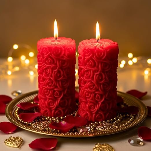 • SHAPE & COLOR: These decorative candles having thick pillar shape having rose outer design with red color.